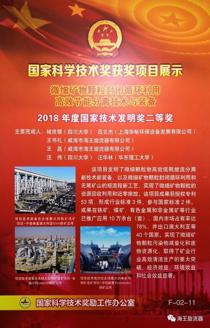 威海市海王旋流器有限公司與四川大學(xué)、華東理工大學(xué)合作研發(fā)的科技成果“微細(xì)礦物顆粒封閉循環(huán)利用節(jié)能分離技術(shù)與裝備”獲我國技術(shù)發(fā)明獎二等獎。