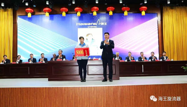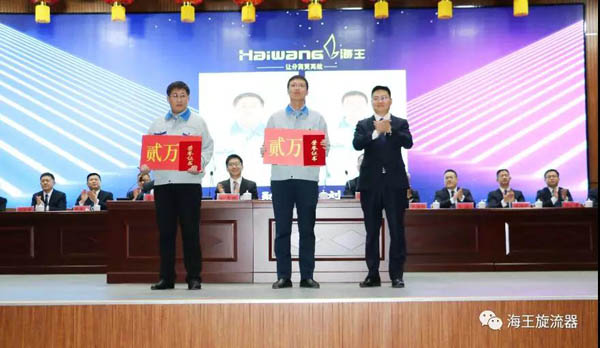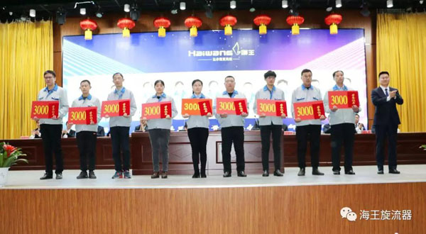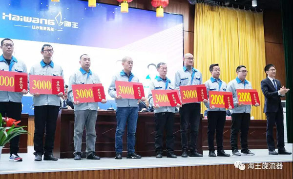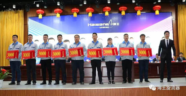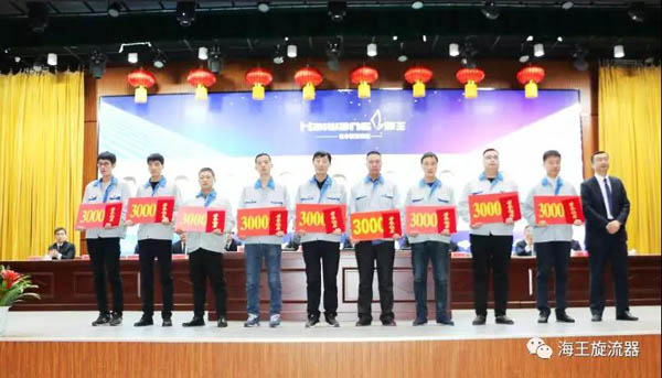 首先由王磊院長宣讀了《威海市海王旋流器有限公司關(guān)于表彰2019年度優(yōu)良團(tuán)隊(duì)和優(yōu)良個(gè)人的決定》,公司董事長孫吉鵬、總經(jīng)理王書禮、總工程師崔學(xué)奇、研究院院長王磊對(duì)獲獎(jiǎng)的3個(gè)優(yōu)良團(tuán)隊(duì)、63名優(yōu)良個(gè)人進(jìn)行表彰授獎(jiǎng)。