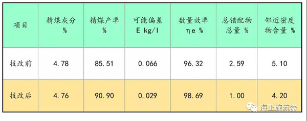 項目實施成功后,優化現有生產指標,穩定精煤產品質量,降低精煤損失,確保重介精煤灰分5%的指標要求,處理能力達到脫泥(Φ1.5mm脫泥)后800t/h以上的入選能力;同時選煤廠重介精煤產率提高2.37%,全年按300天,每天14小時核算,則選煤廠全年新增精煤回收8萬余噸,新增經濟效益600余萬元。