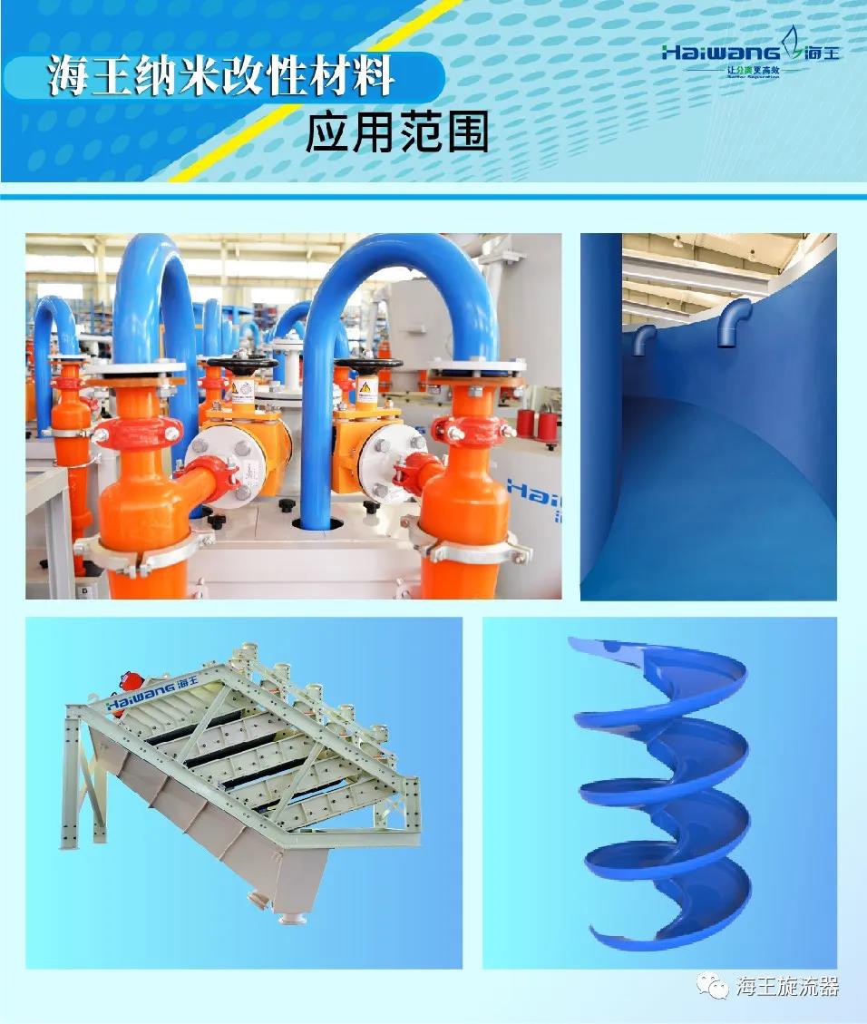 海王納米改性材料在礦山、煤炭、電力等多個行業(yè)應用成功,作為“硬核”的耐磨、耐蝕材料,可應用于旋流器、振動篩、螺旋分選機等設備的過流部位,也可應用于箱體、溜槽、漏斗、管路等非標設施過流部位。