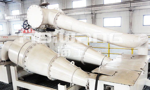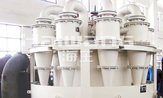 根據處理能力的不同,通常將同規格旋流器并聯組合,成組供應。旋流器組由進料分配器、溢流箱、底流箱、支架等部分組成。合理的設計分配器、箱底傾角大小將有利于設備的正常運行。